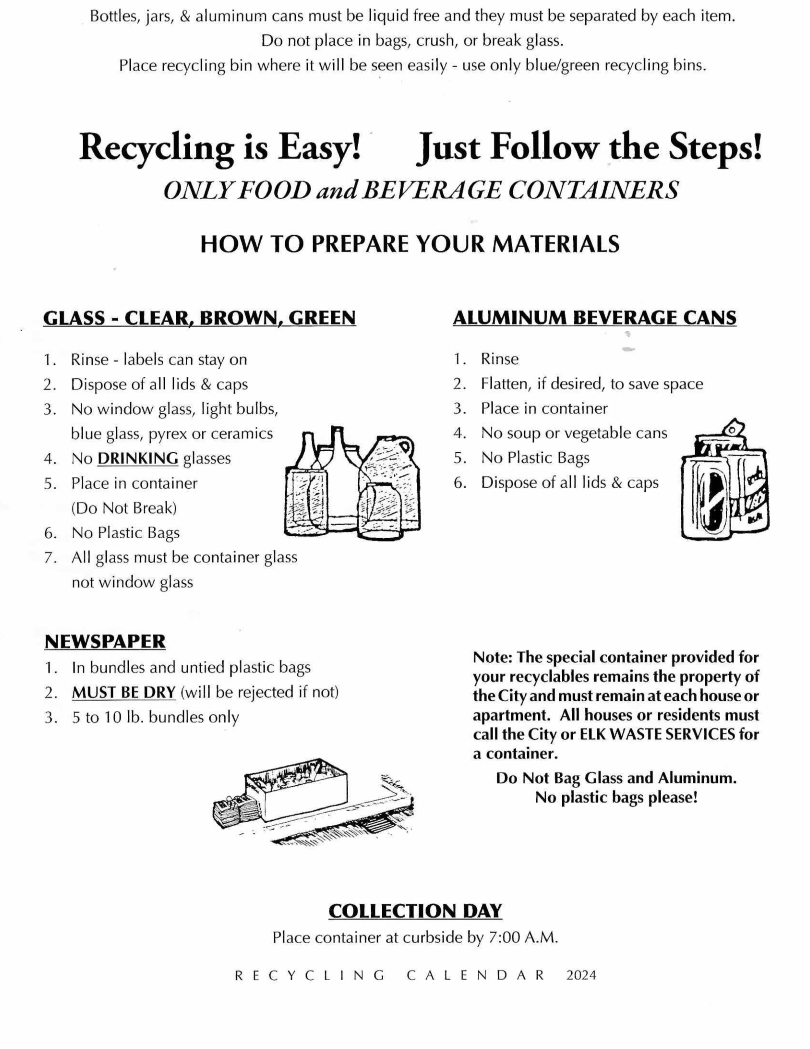 The City of St Marys has contracted Elk Waste Services to do the curbside collection of recyclables. What and when they are collected is as follows: